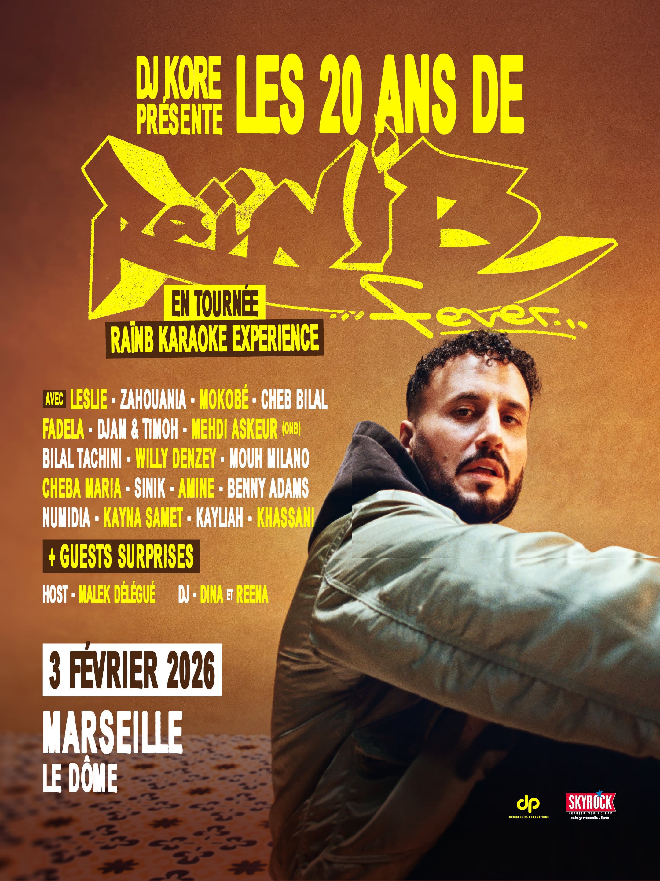 Après avoir enflammé un Olympia complet, DJ Kore revient en force pour fêter les 20 ans de Raï’N’B Fever en tournée dans toute la France. L’occasion de célébrer ce collectif de légende qui a su mêler les genres, les générations et les continents depuis 2004. Accompagné par ses invités surprises, Kore vous fera revivre les hits intemporels ainsi que les nouveaux tubes de Raï’N’B Fever, avec :